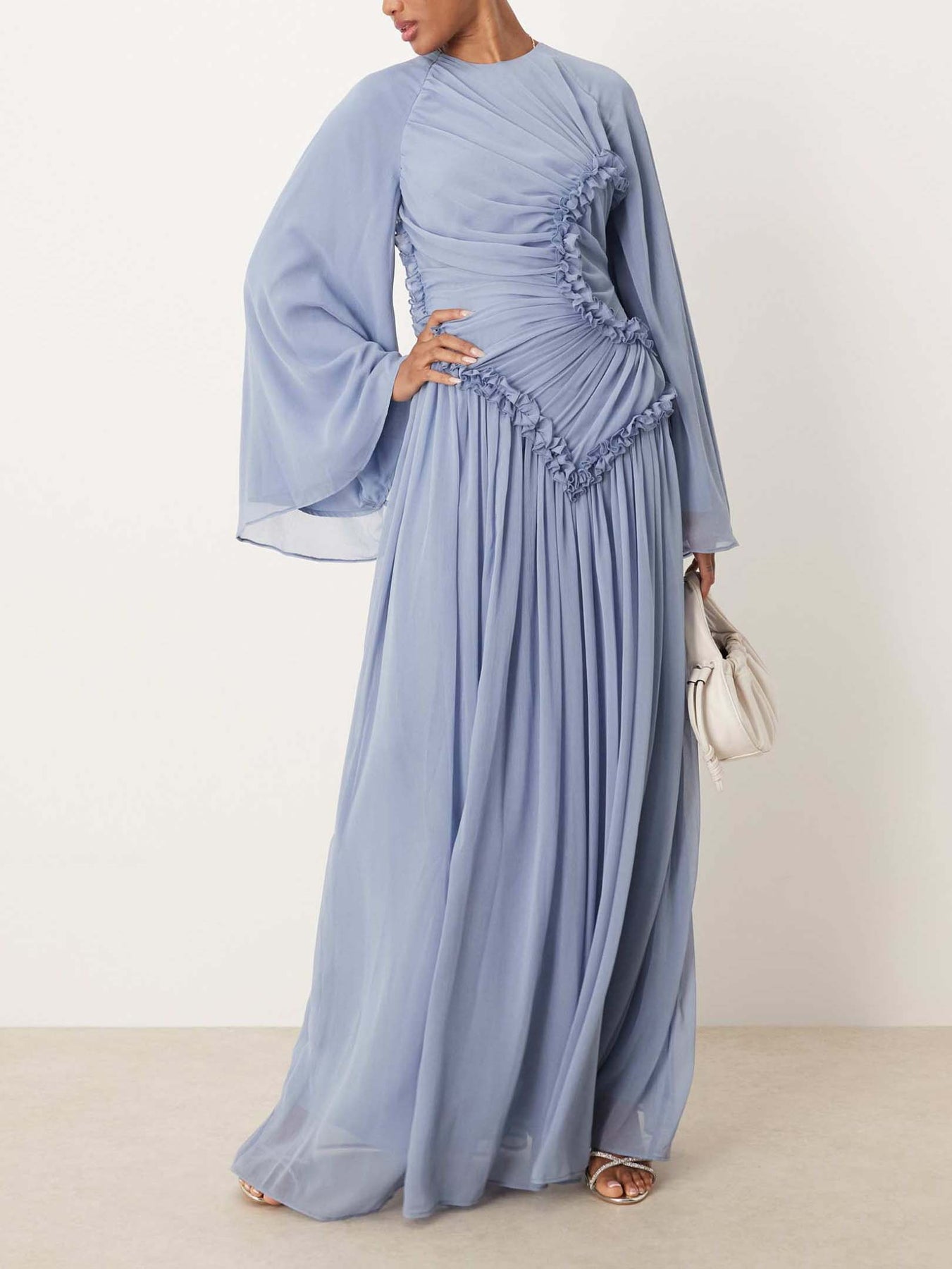 This elegant maxi dress features soft chiffon fabric with pleated detailing, delicate ruffle accents, and flowing long sleeves. Designed with a graceful silhouette, it’s perfect for formal occasions and evening events.
