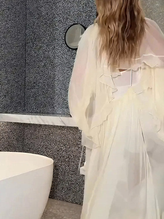 Delicate and graceful, this chiffon maxi dress features soft ruffles and a flowing silhouette that moves beautifully with every step. The lightweight fabric drapes elegantly, creating a romantic and feminine look perfect for special occasions or dreamy summer evenings. Effortless yet refined, it captures timeless elegance with modern charm.