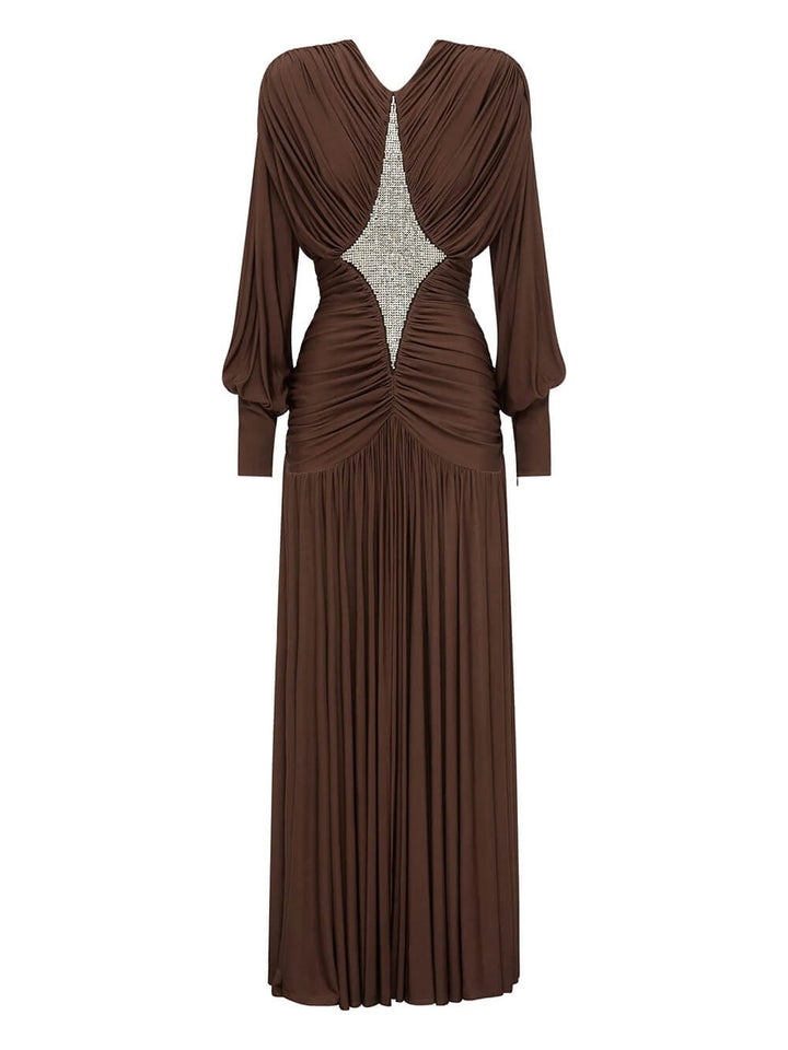 Elegant Sequin Panel Ruched Lantern-Sleeve Bodycon Maxi Dress