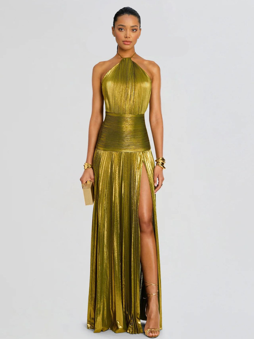 Elegant Pleated Metallic Tie-Waist Party Slit Gown Maxi Dress