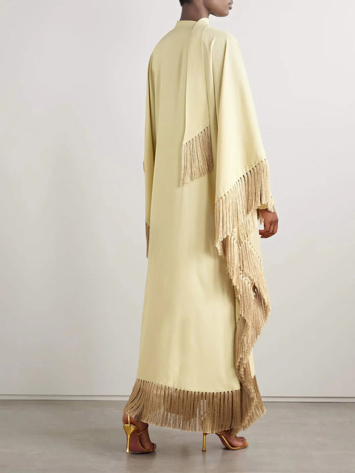 Elegant Fringed Satin Robe Maxi Dress – Luxurious satin fabric with delicate fringe trim, featuring a flowing robe-style silhouette. Ideal for evening soirées or special occasions, paired with strappy heels and subtle jewelry for a graceful, sophisticated look.