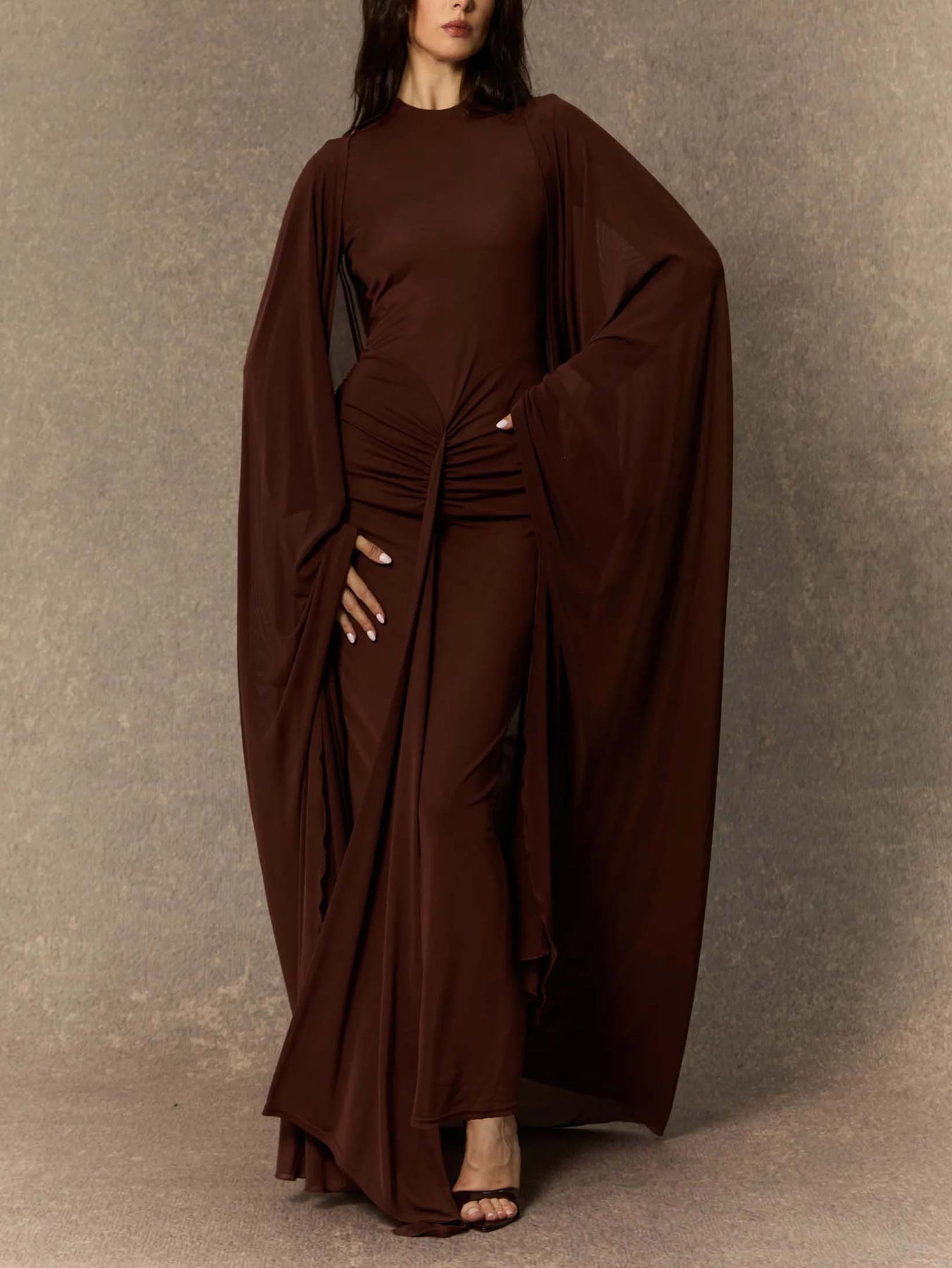 Make a dramatic statement with this elegant maxi dress featuring fluid, cape-like sleeves and a flattering ruched waist design. The soft, draping fabric moves gracefully with every step, creating an ethereal, goddess-like silhouette. Perfect for evening events, galas, or any occasion where you want to exude confidence and sophistication.