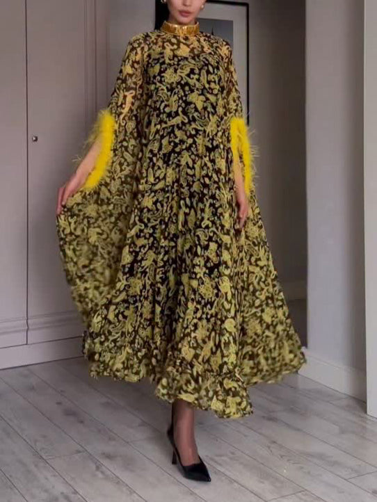 Casual Pleated Printed Chiffon High-Neck Maxi Dress