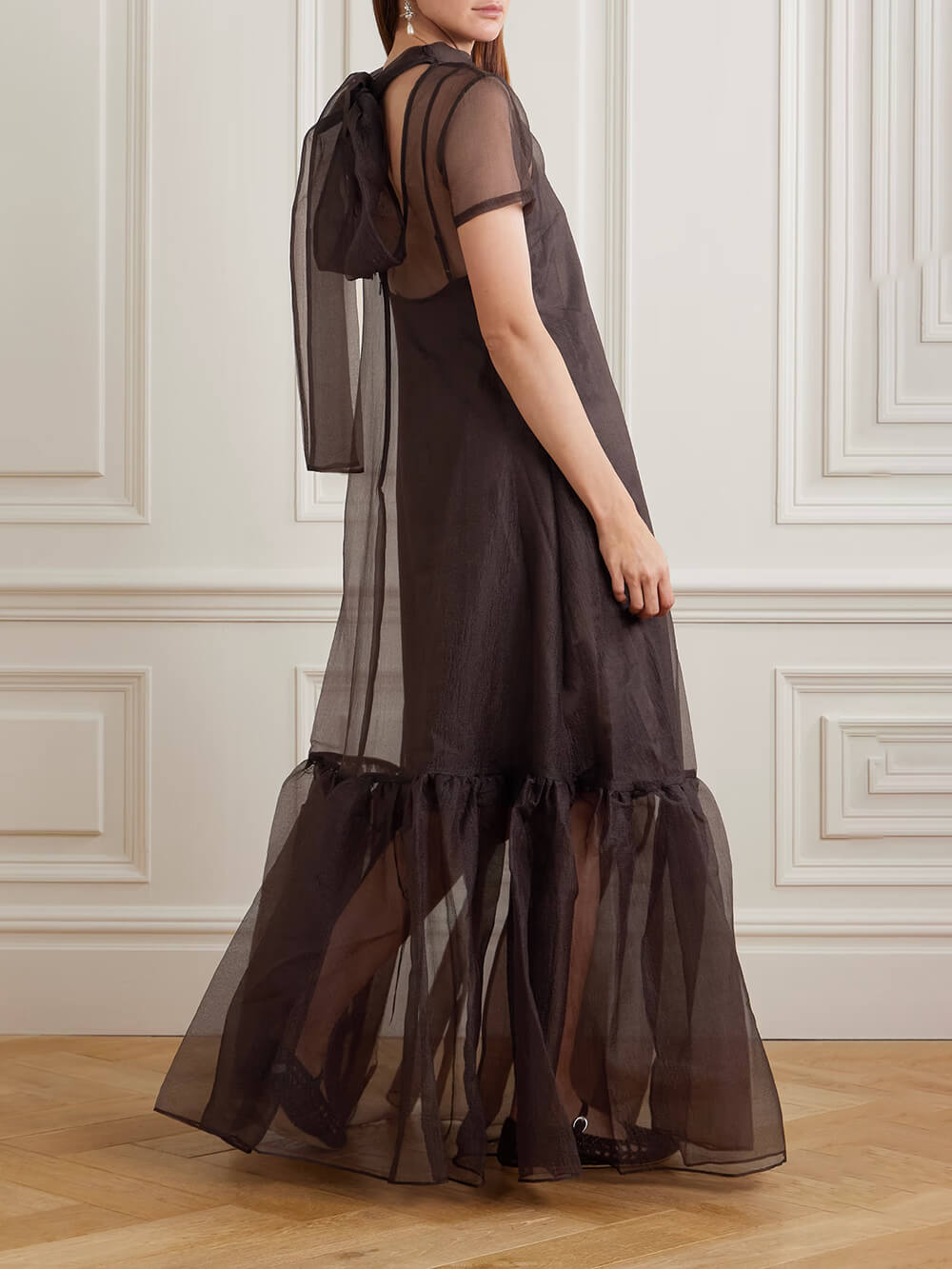 Casual Lace-up Neck Layered Organza Maxi Dress