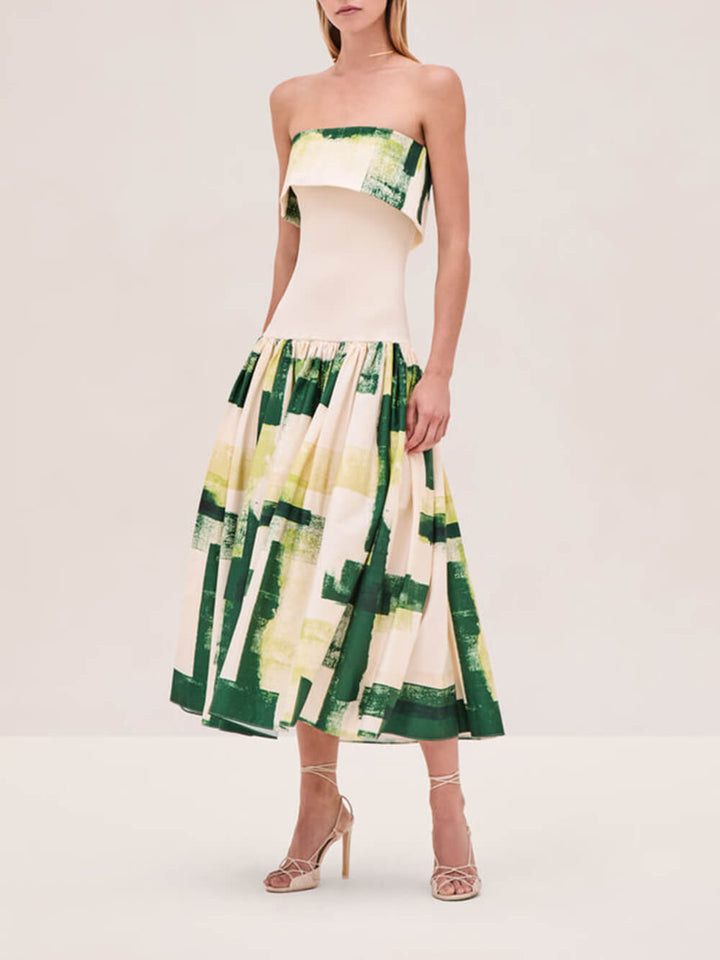 Elegant Printed Strapless Ribbed Bodycon Midi Dress