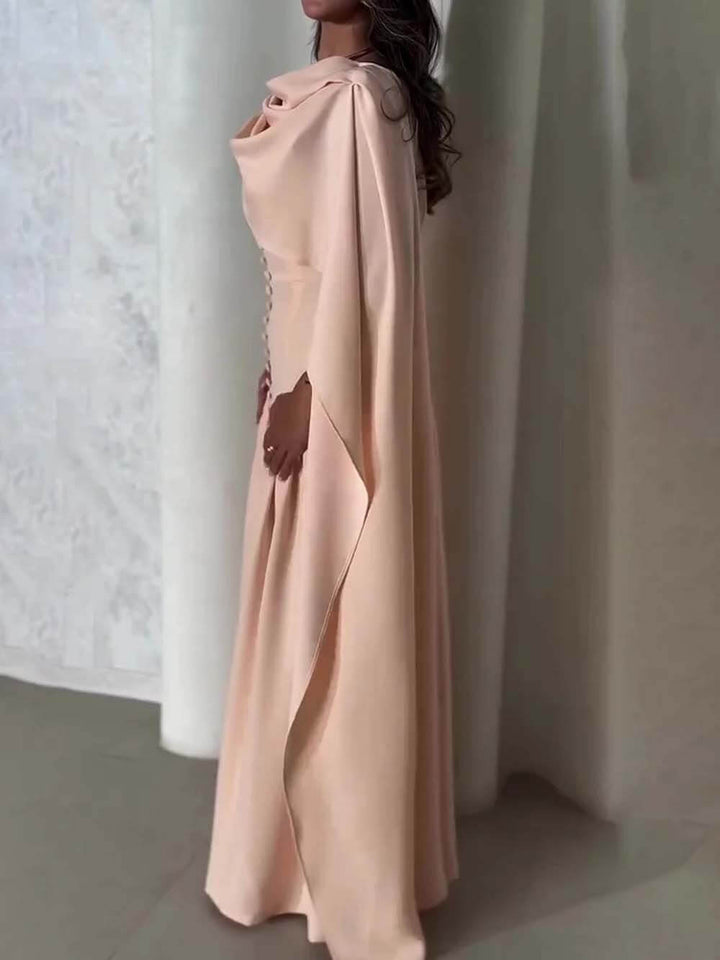 Make a statement in this distinctive cape-style maxi dress, featuring a fitted corset bodice that beautifully accentuates your figure. The flowing cape adds drama and elegance, creating a striking silhouette with every step. Perfect for evening galas, red-carpet events, or any special occasion, this dress blends bold design with timeless sophistication.