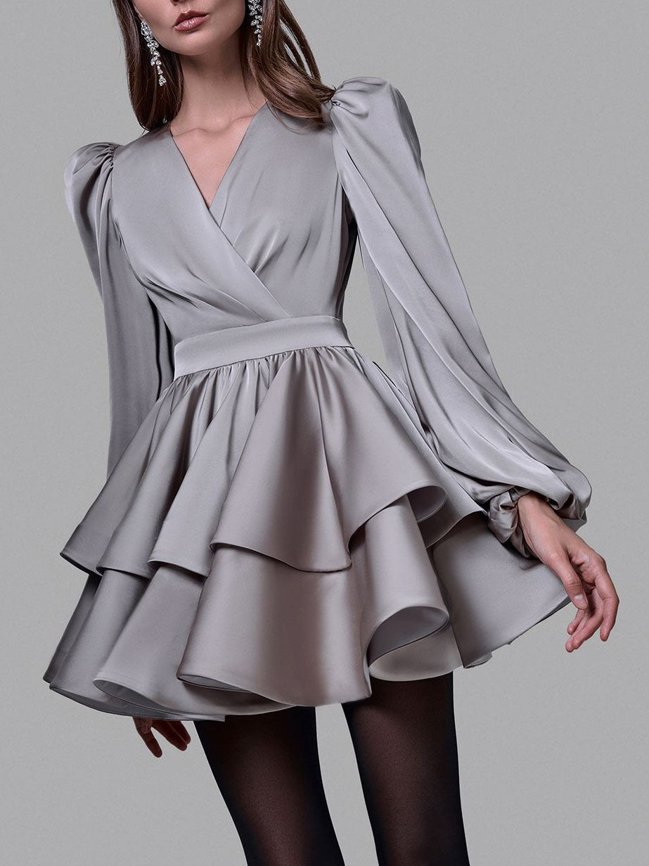 Elegant Satin Pleated Bell Sleeve Mini Dress