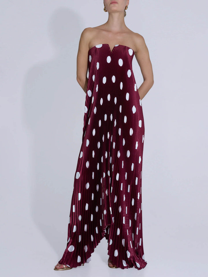 Elegant Strapless Polka Dot Print Pleated Maxi Dress