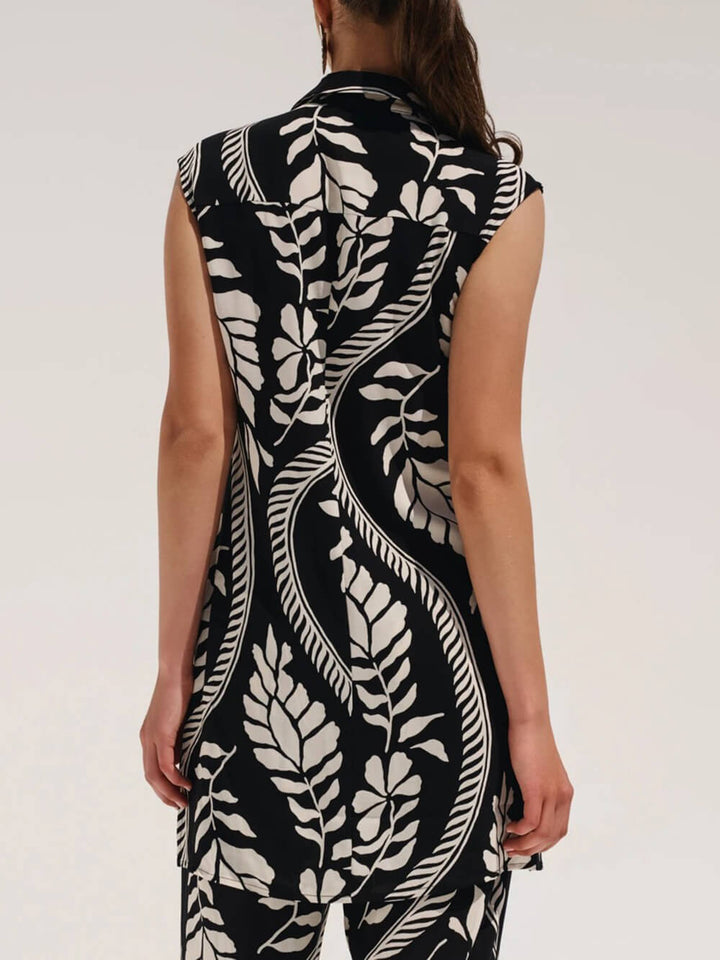 Moderne, verfijnde, satijnen oversized blouse met unieke print en knoopsluiting