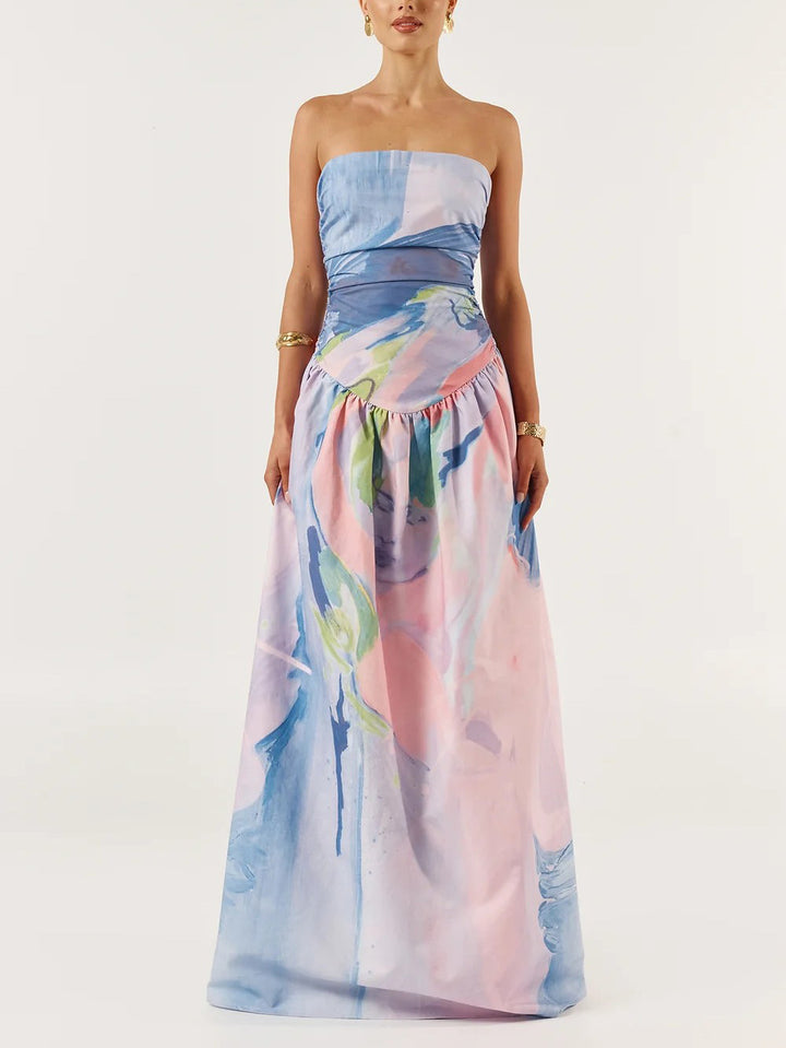 Elegant Oil Painting Printed Off Shoulder Bustier Gown Maxi Dress