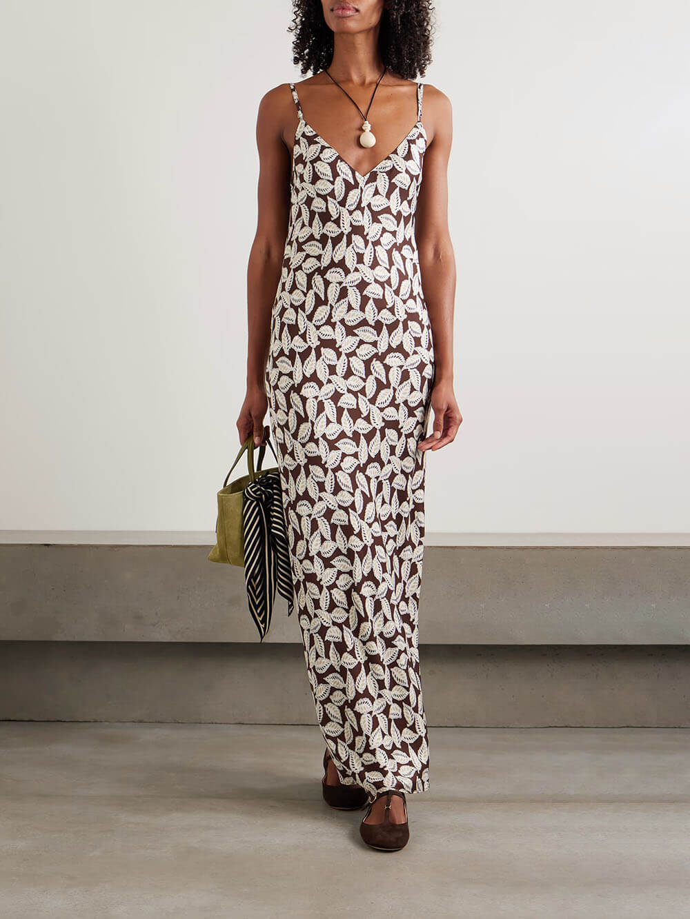 Elegant Backless Paper Birch Print Twill Maxi Dress