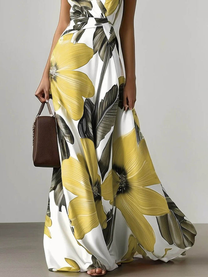 Elegant Floral Print Classic V Neck Sleeveless A-Line Maxi Dress
