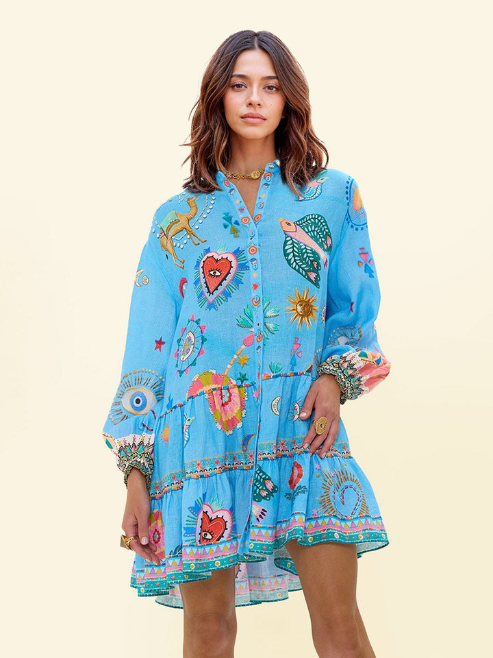 Med et kunstnerisk håndmalt trykk og en flatterende minisilhuett, kombinerer denne kjolen kreativitet med stil.