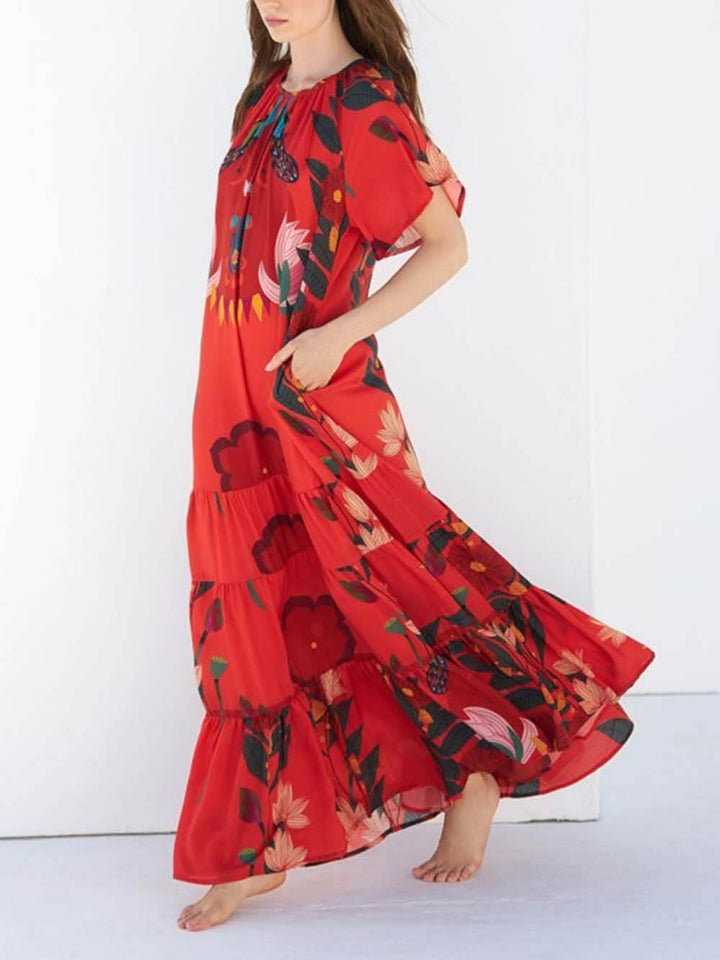 Unique Floral Print Drop-Shoulder Short-Sleeve Maxi Dress