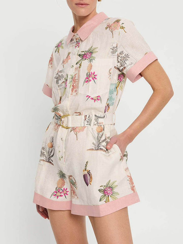 Elegant Floral Print Lace-Up Linen Cardigan Shirt Jumpsuit