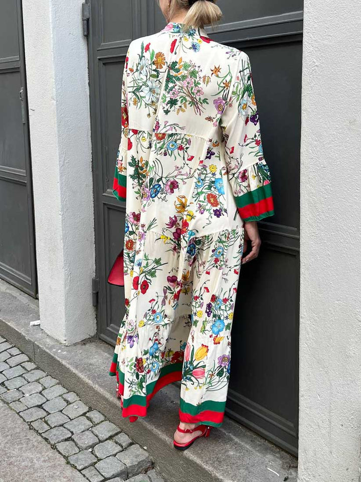 Designed for a sun-soaked getaway, this dress features a chic floral print and a fresh design inspired by tropical flowers. Flowing flared sleeves and a casual yet sophisticated silhouette. The lightweight fabric drapes beautifully, perfect for vacations, beachside strolls, or summer parties.
