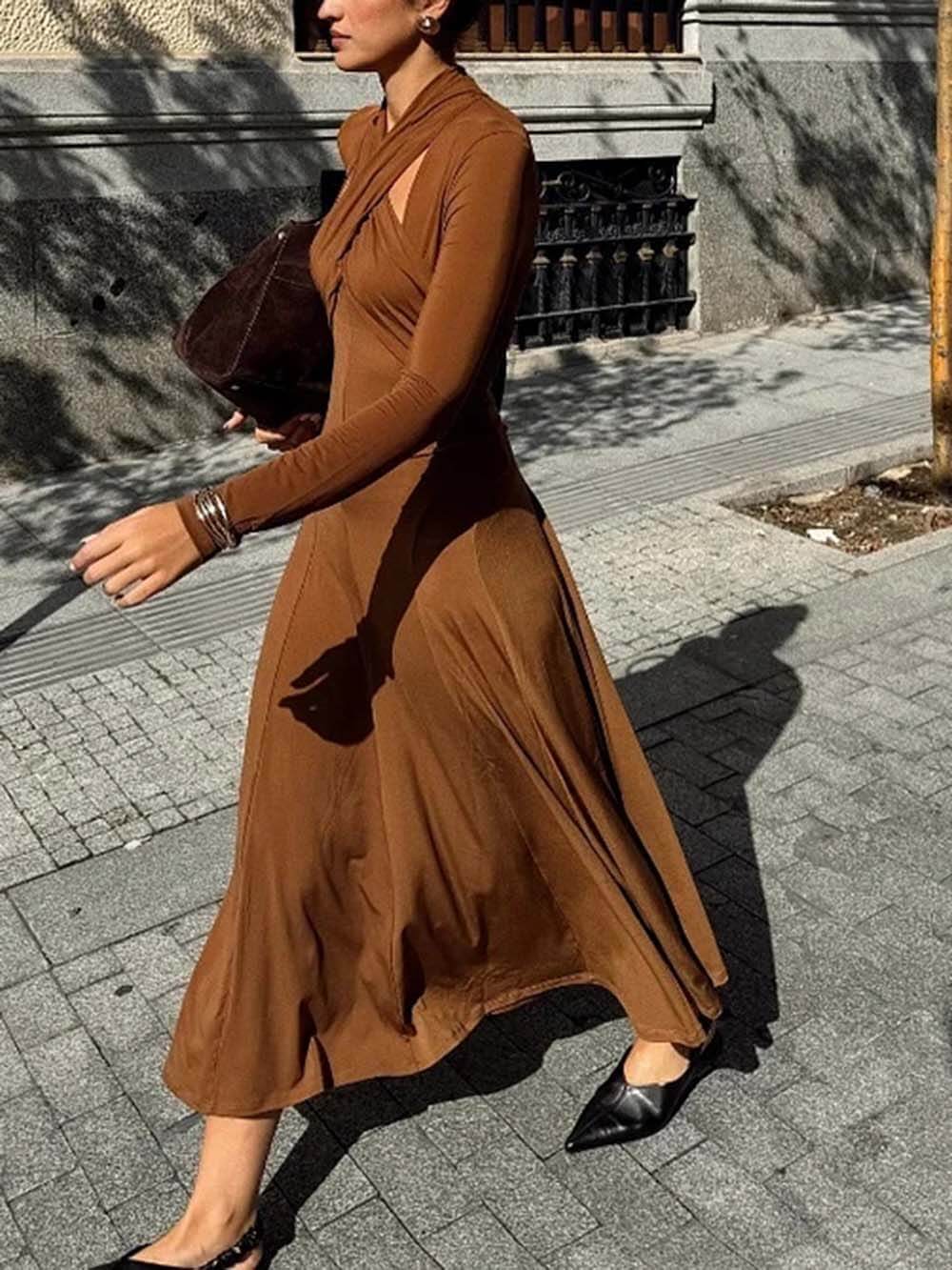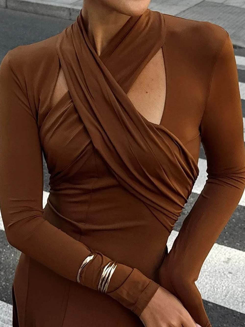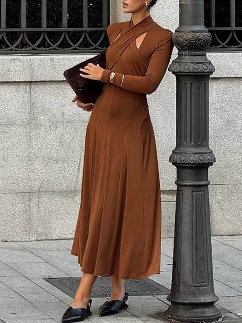 Fashionable Cut-Out Fitted Solid Long-Sleeve Maxi Dress