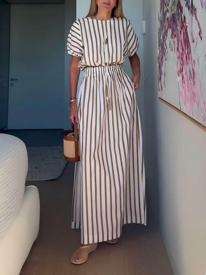 Stay stylish and comfortable in our exquisite unique stripe print elastic waist slit pocket maxi skirt.