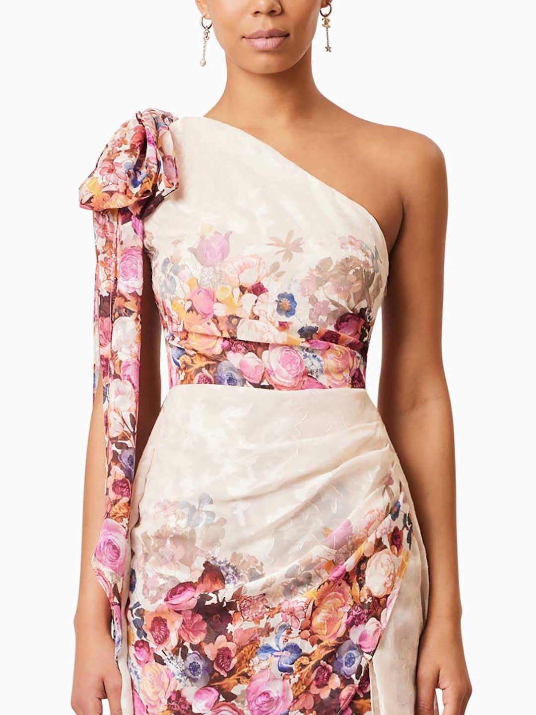 Elegant One-shoulder Bow Sleeve Floral Print Draped Top