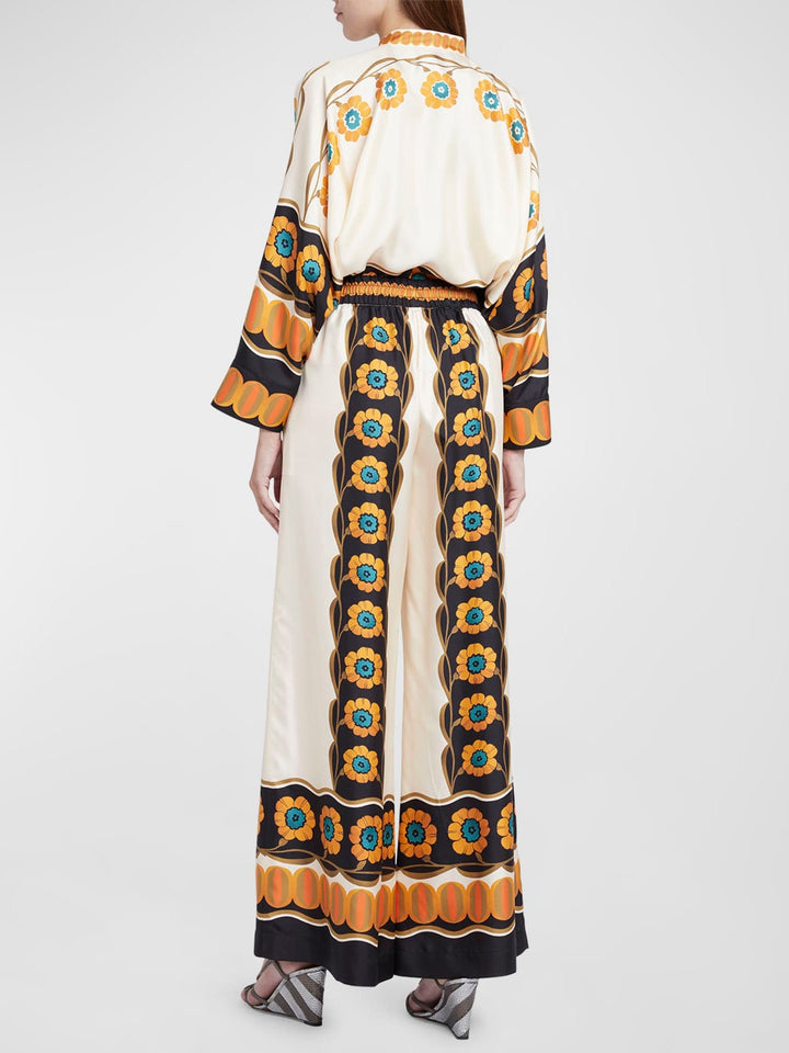 Calças largas soltas com estampa de flor de caju exclusiva de cetim requintado