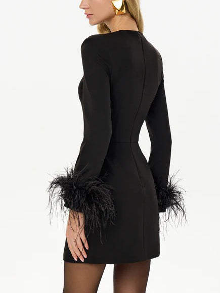 This chic mini dress features dramatic feather sleeves that add an extravagant flair to the design. The slit at the side enhances the dress's modern silhouette, offering a touch of sophistication and allure. Perfect for evening parties or special occasions, this dress exudes confidence and elegance while ensuring you stand out with its bold and fashionable details.