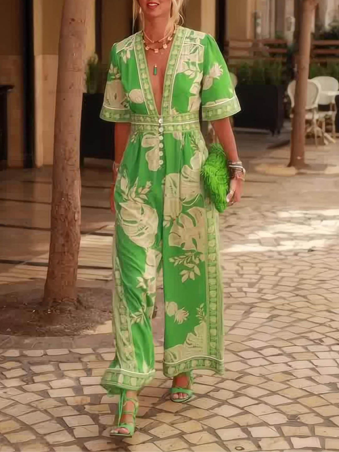 Fresh Holiday Floral Print V-Neck Short Sleeve Jumpsuit