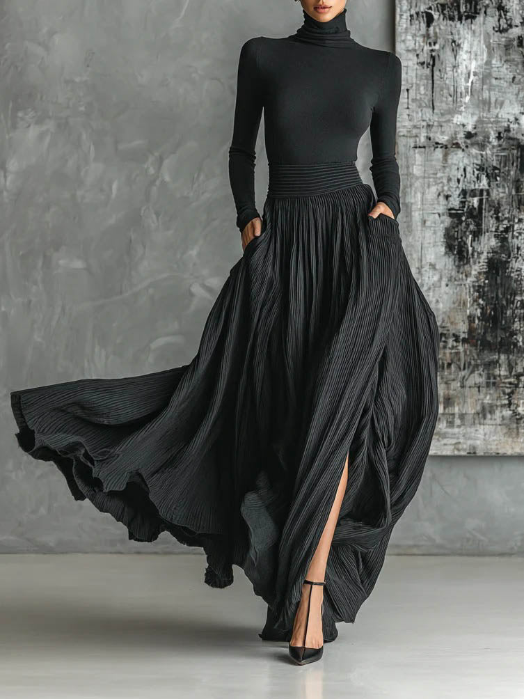 Flowing with effortless grace, this high-waisted pleated maxi skirt combines timeless elegance with contemporary flair. The delicate pleats create dynamic movement, while the side slit adds a touch of allure — ideal for both formal occasions and chic daily wear.