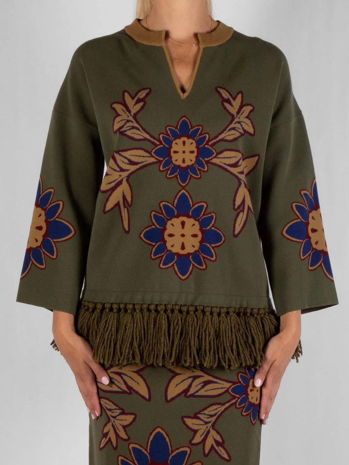 This cozy sweater features a distinctive symmetrical pattern and playful fringed detailing for a modern bohemian touch. Crafted from soft, comfortable knit fabric, it offers a relaxed fit that’s perfect for effortless everyday style. Pair it with jeans or skirts for a chic yet laid-back look that transitions seamlessly from day to night.