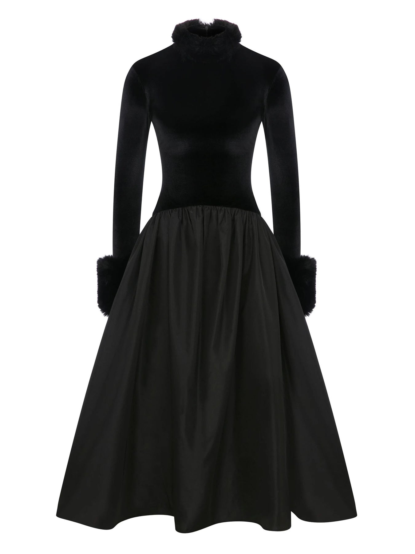 A refined midi dress featuring a luxurious velvet bodice, soft faux fur cuffs, and a graceful high neckline. The voluminous A-line skirt adds movement and sophistication, creating a timeless silhouette perfect for formal occasions, evening events, or holiday gatherings. Effortlessly elegant with a touch of vintage charm.