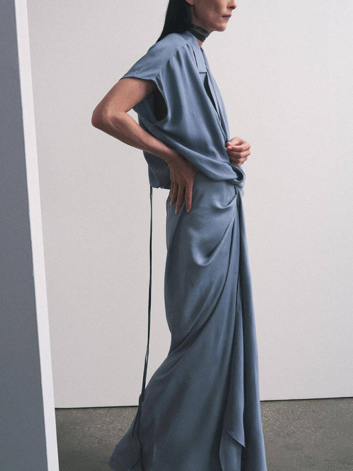 Rochie maxi subțire, elegantă, cu decolteu în V, fără spate, cu șireturi