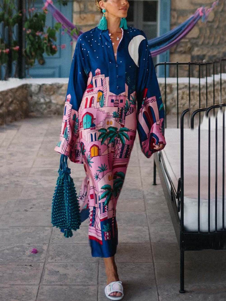Unique Seaside Satin Print Button Up Long Sleeve Slit Kaftan Midi Dress
