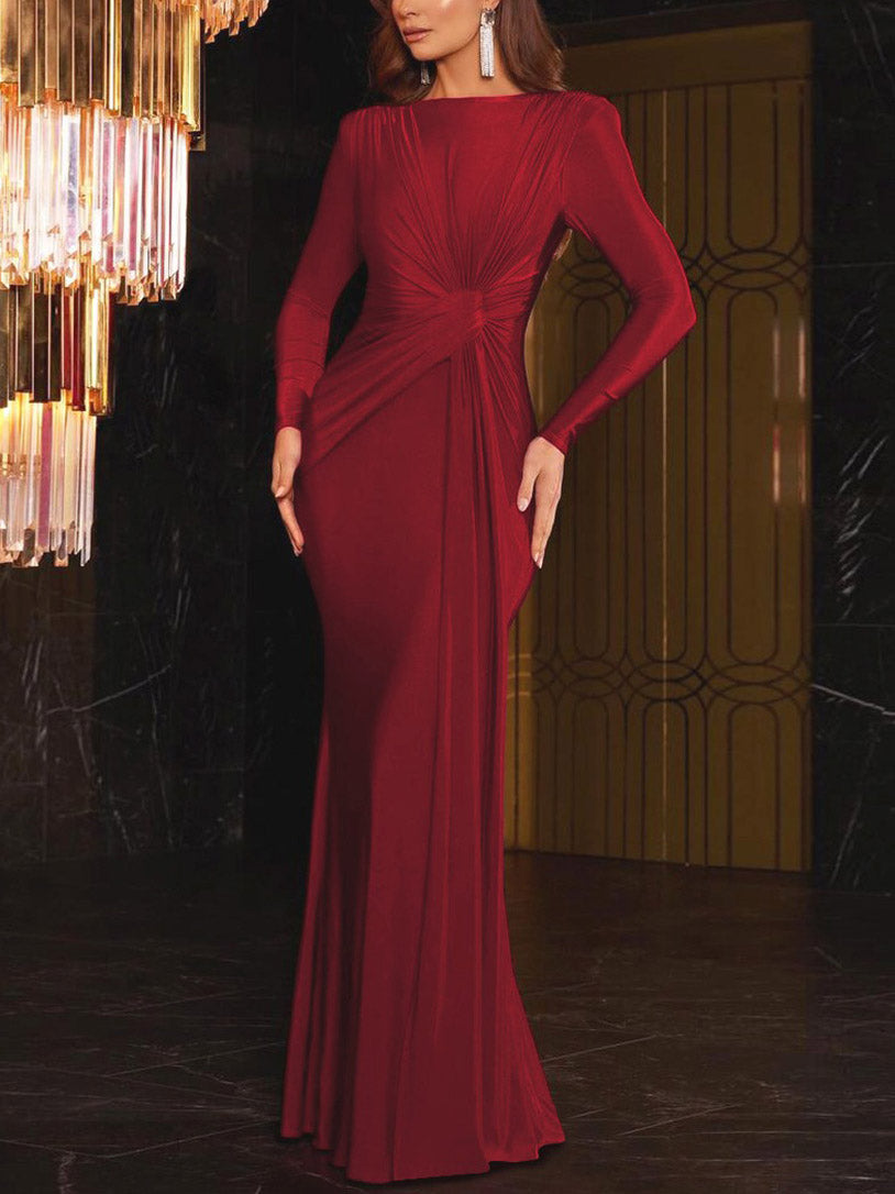Elegant Crew Neck Pleated Wrap Hem Maxi Dress