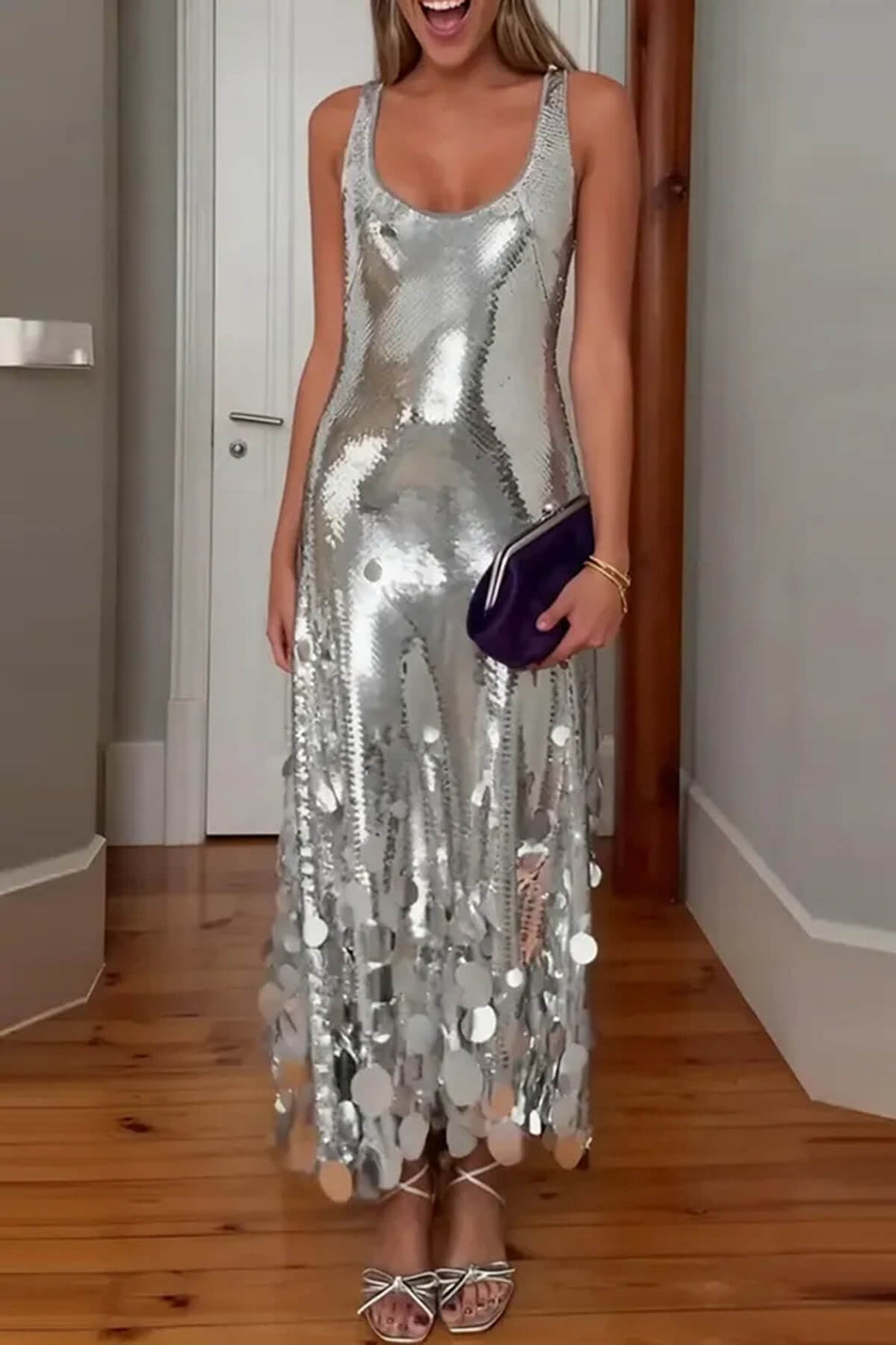 Exquisite Party Tips Sequin Irregular Round Tassels Hem Back Cutout Tank Maxi Dress