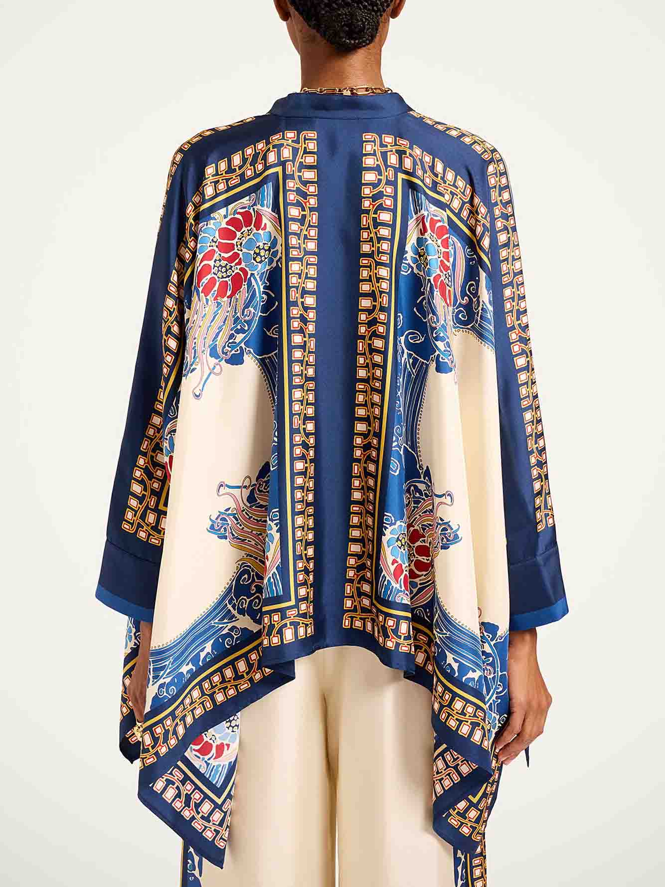 A coordinated set showcasing a draped printed kimono shirt paired with matching wide-leg pants. Eye-catching, relaxed, and perfect for elevated bohemian style.