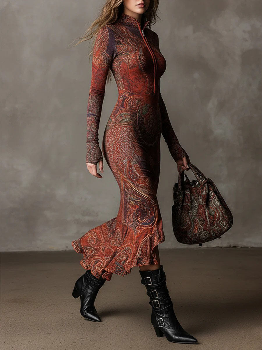 This retro-style midi dress features a bold bohemian print, paired with a stylish half-zip neckline and an elegant asymmetrical hem. Unique, free-spirited, and effortlessly chic, it perfectly showcases vintage charm.