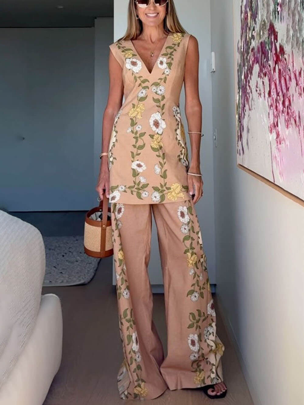 Chic Perfect Style Linen Blend Floral Midi Sleeveless Top