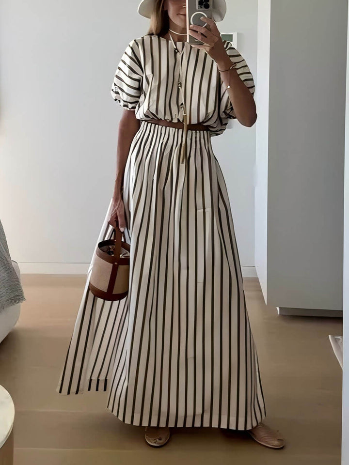 Exquisite Unique Striped Print Elastic Waist Slit Pocket Maxi Skirt