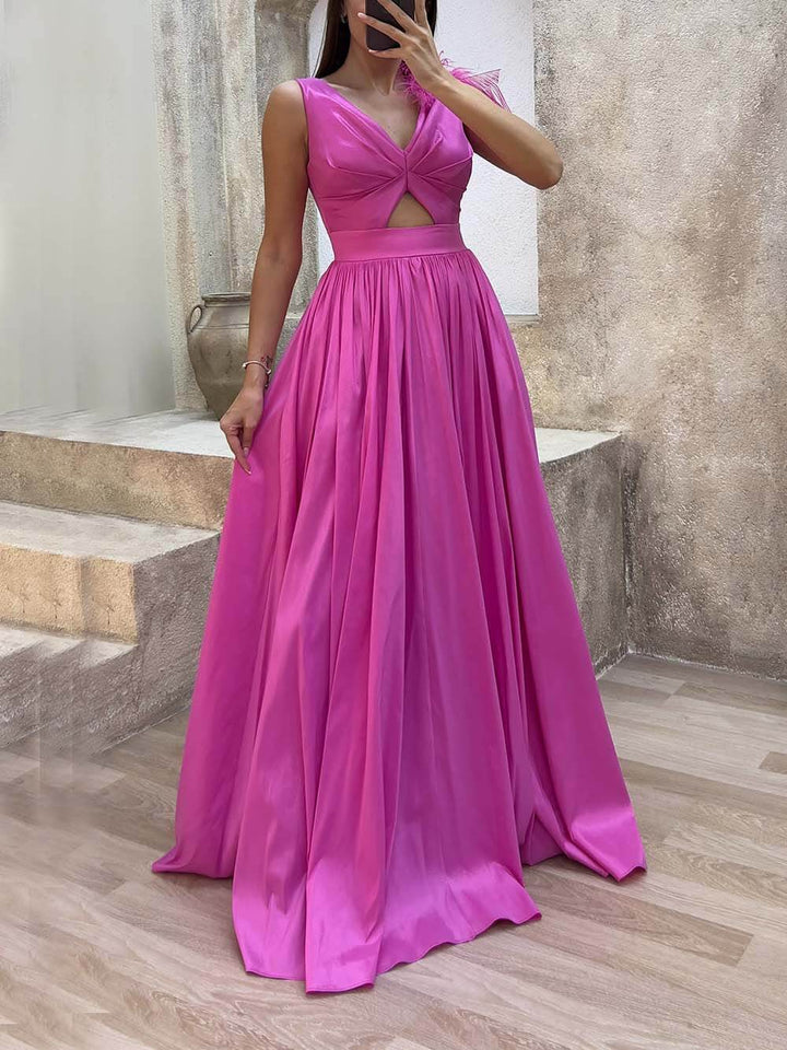 A stunning evening gown featuring elegant feather accents at the waist for a touch of glamour. Designed with a flattering silhouette and refined details, perfect for formal events and unforgettable nights.