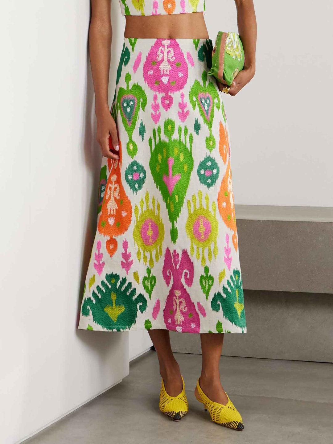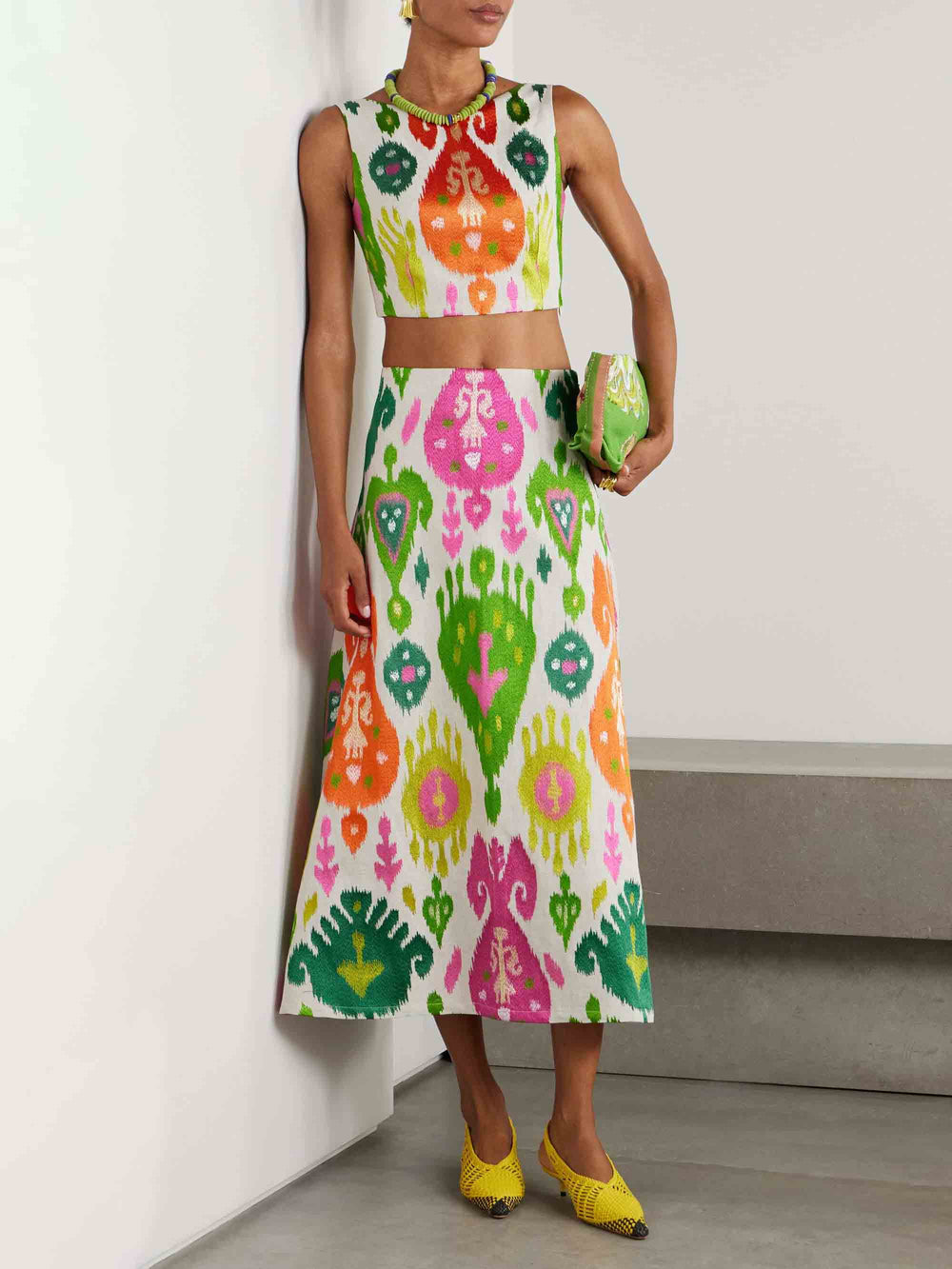 Featuring a colorful, eye-catching ikat-inspired print, it will liven up any look and can be worn with the same skirt or with high-waisted jeans for a playful look.