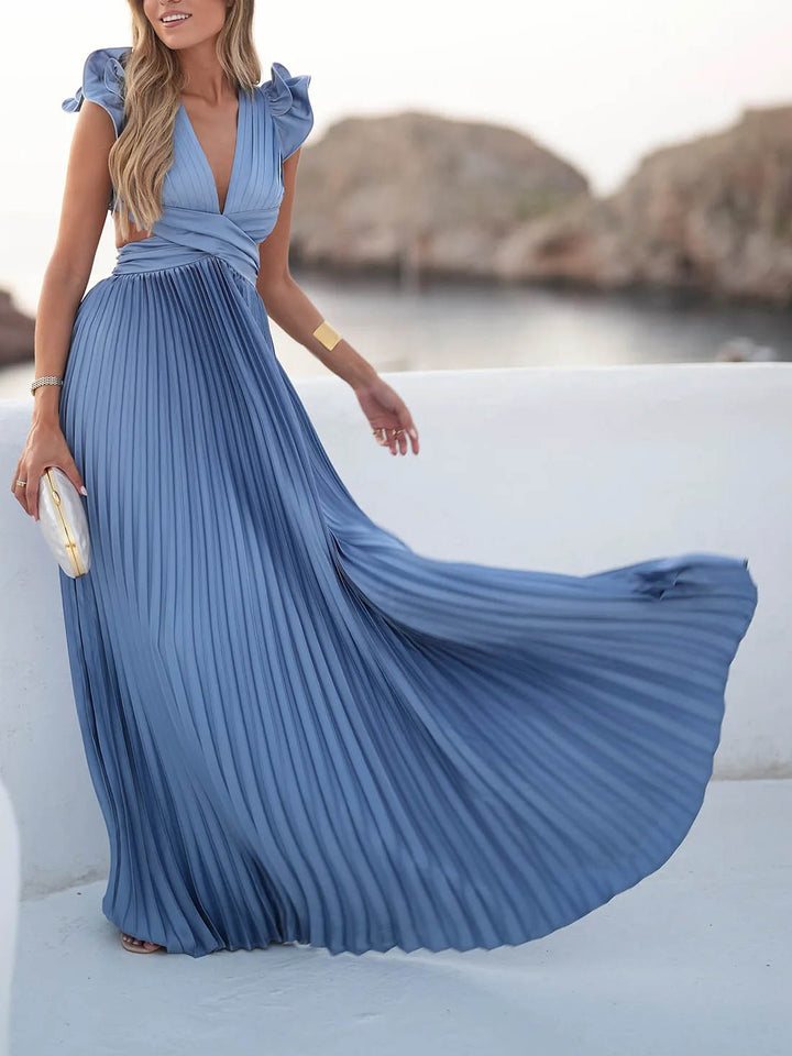 Elegant V-neck Open Back Pleated Ruffle Maxi Dress