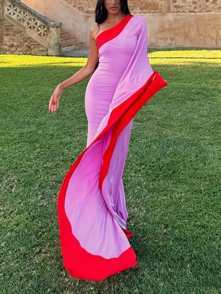 Exquisite One-Shoulder Colorblock Draped Maxi Dress