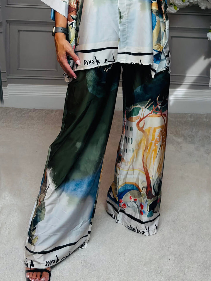 Unique Satin Roman Print Elastic-Waist Wide-Leg Pants – Perfect for vacations or city strolls, these pants feature luxurious satin fabric, artistic Roman prints, a comfy elastic waist, and flowing wide legs for effortless style.