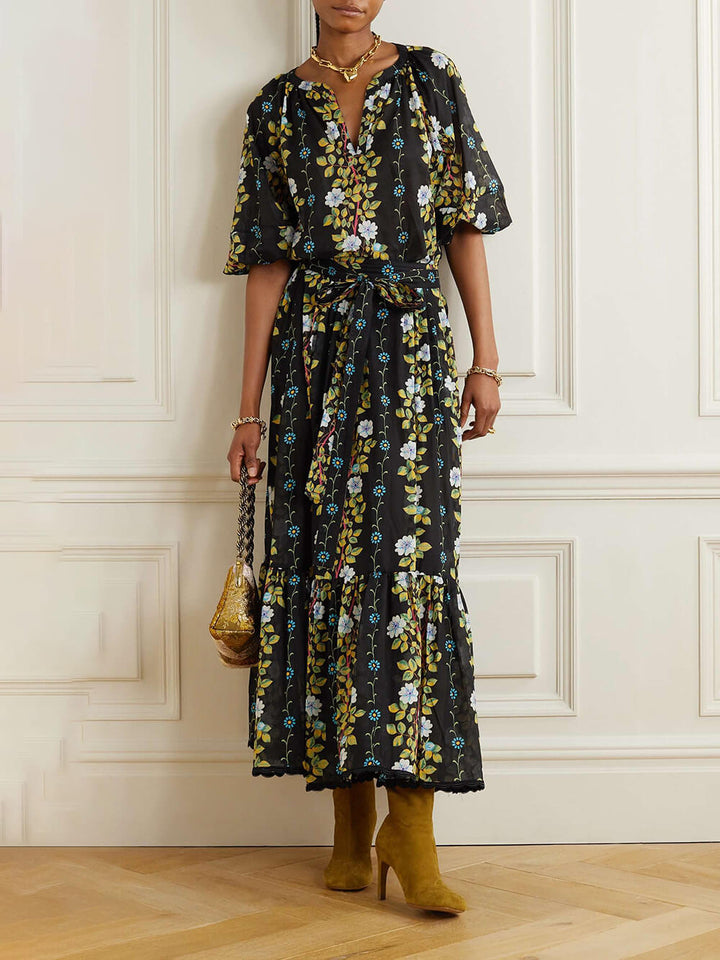 Zarif Boyalı Çiçek Desenli V Yaka A Kesim Maxi Elbise