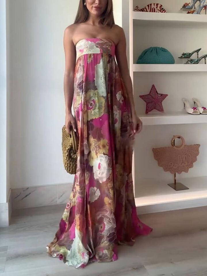 Elegant Chiffon Pleated Wavy Ruffles Trim Strapless Loose Maxi Dress