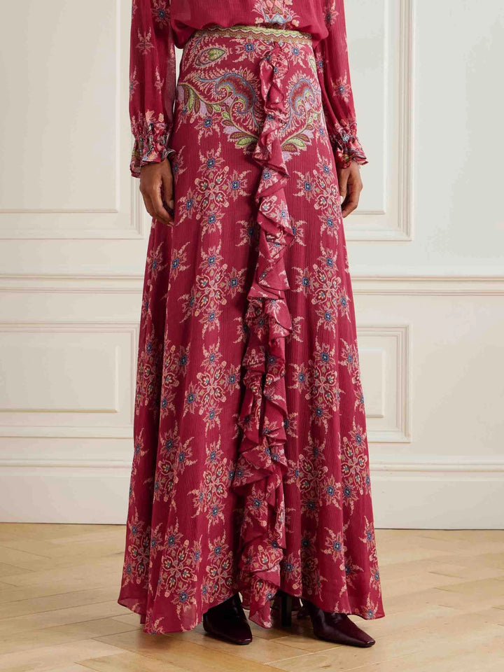 Exquisite bohemian ruffled chiffon skirt featuring a vibrant print and flowing silhouette. Lightweight and graceful, it captures effortless charm with every step, perfect for both casual outings and elevated occasions.