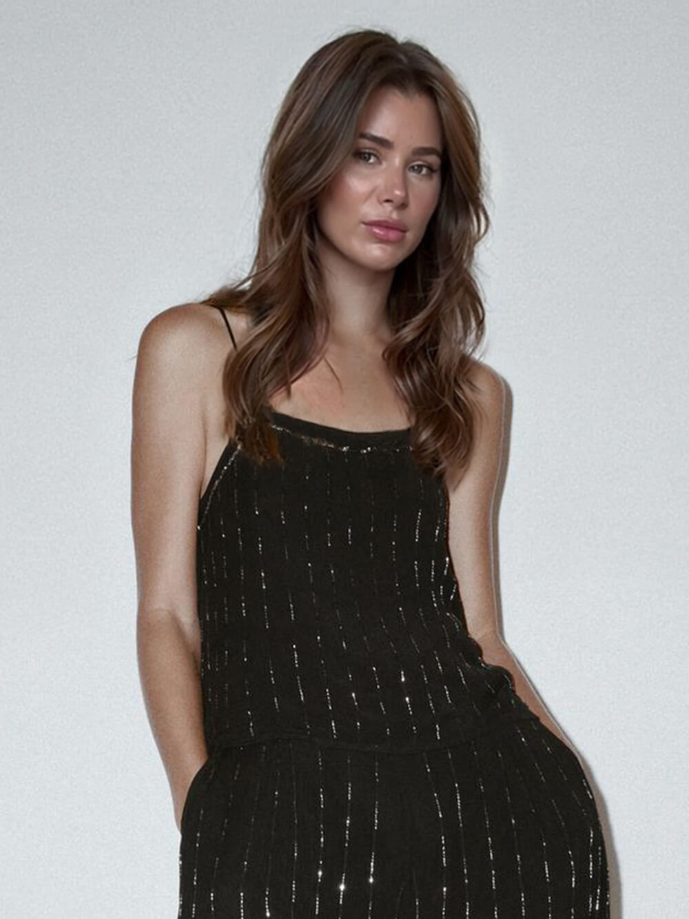 Elevate your wardrobe with this timeless yet eye-catching camisole top, designed to blend classic elegance with modern flair. Featuring chic color-blocking and delicate beaded embellishments, it adds a refined touch of sparkle to a sleek, minimalist silhouette. The slender spaghetti straps create a flattering neckline, making this piece perfect for layering or wearing on its own for a polished statement look.